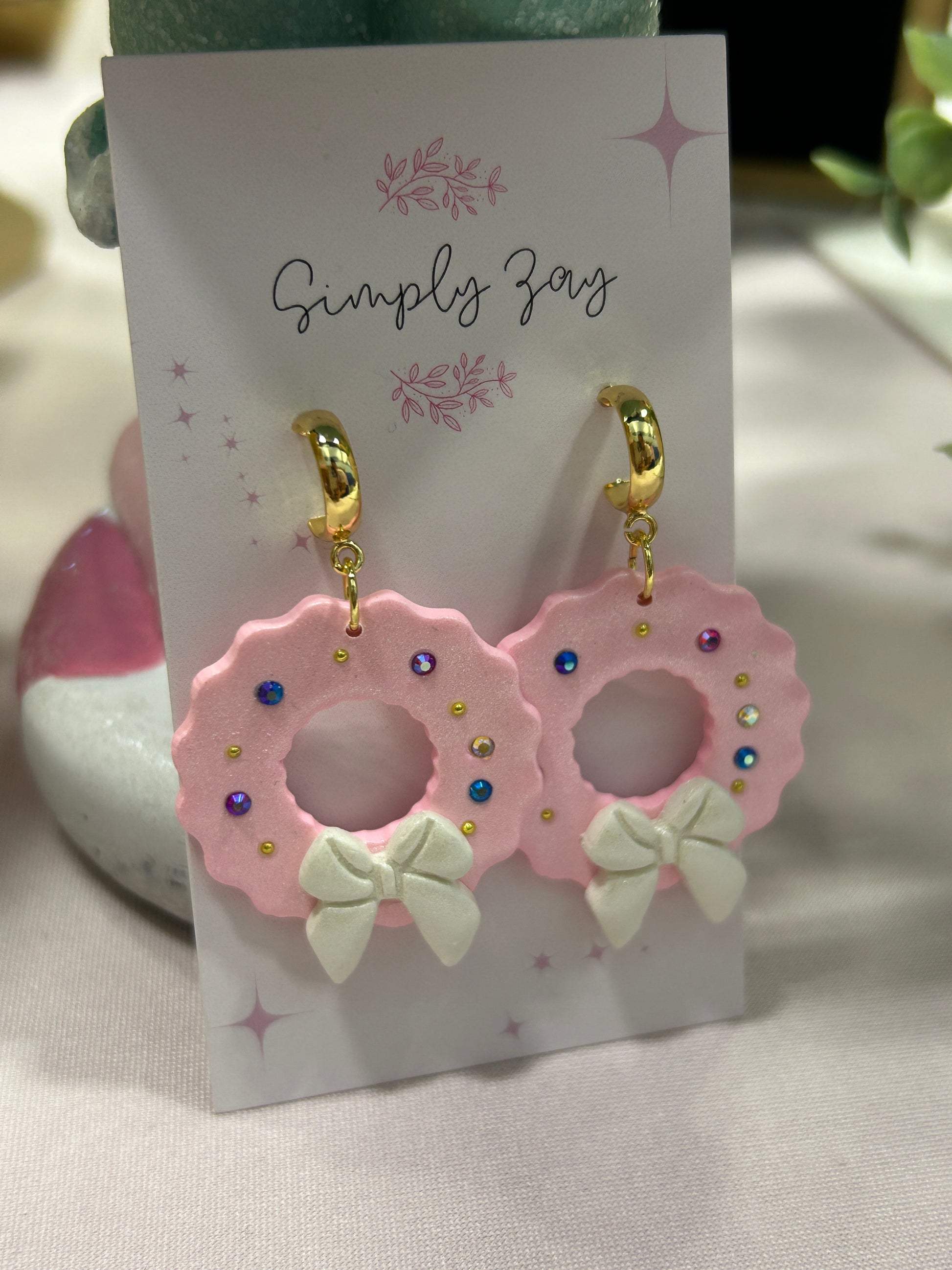 Perfect holiday earrings. These wreaths feature a beautiful pink shimmer with embedded different colored stones.