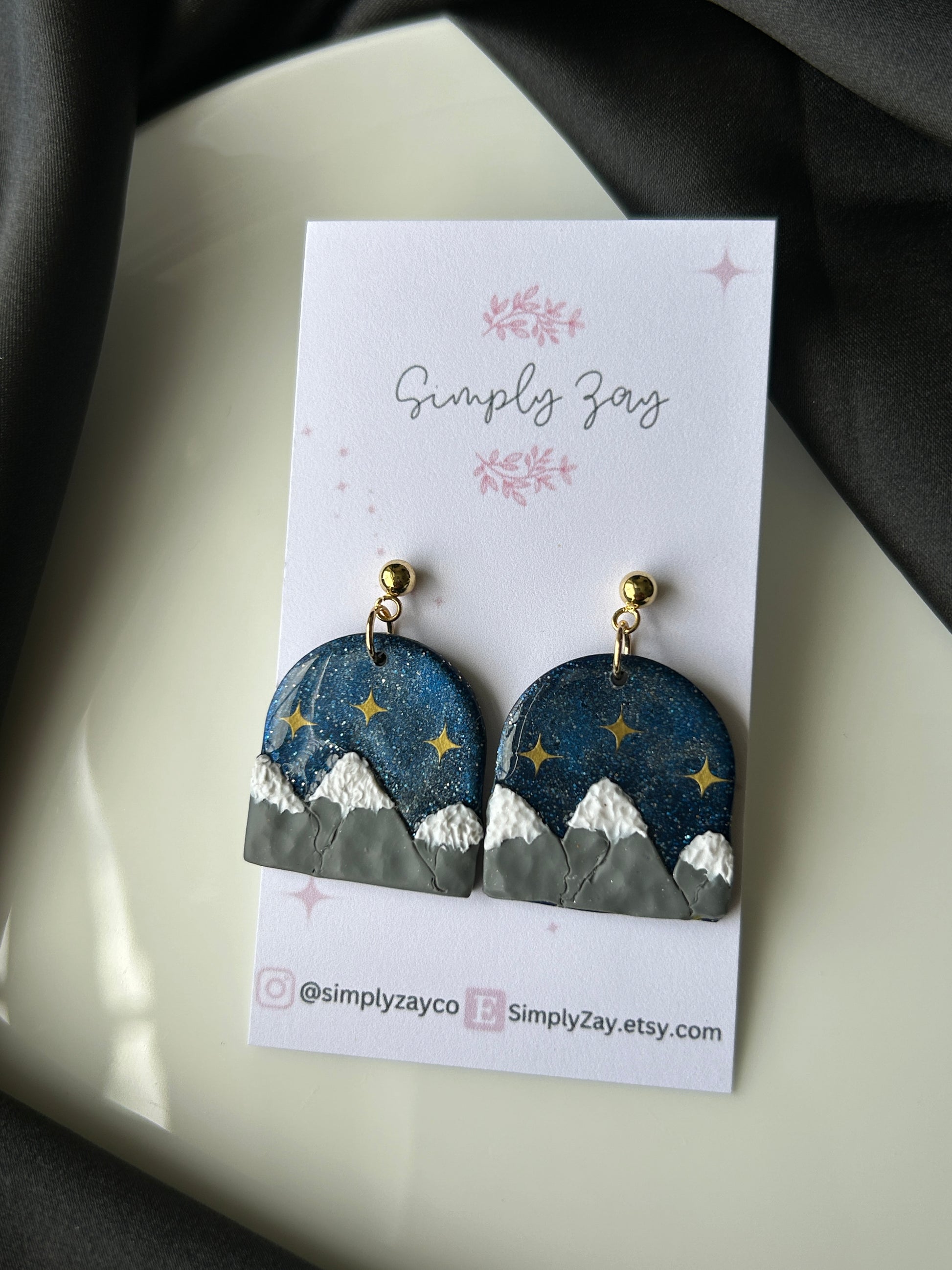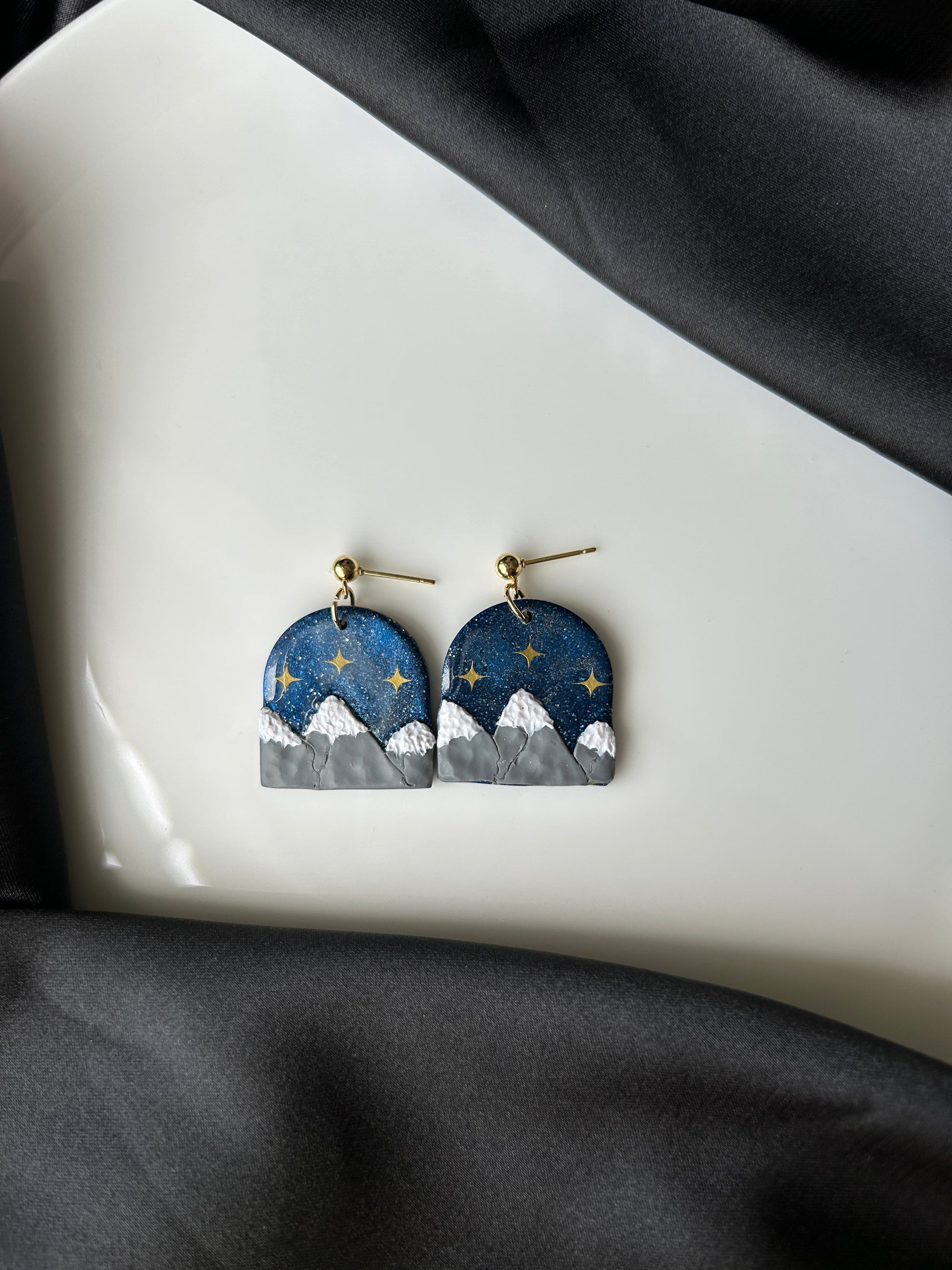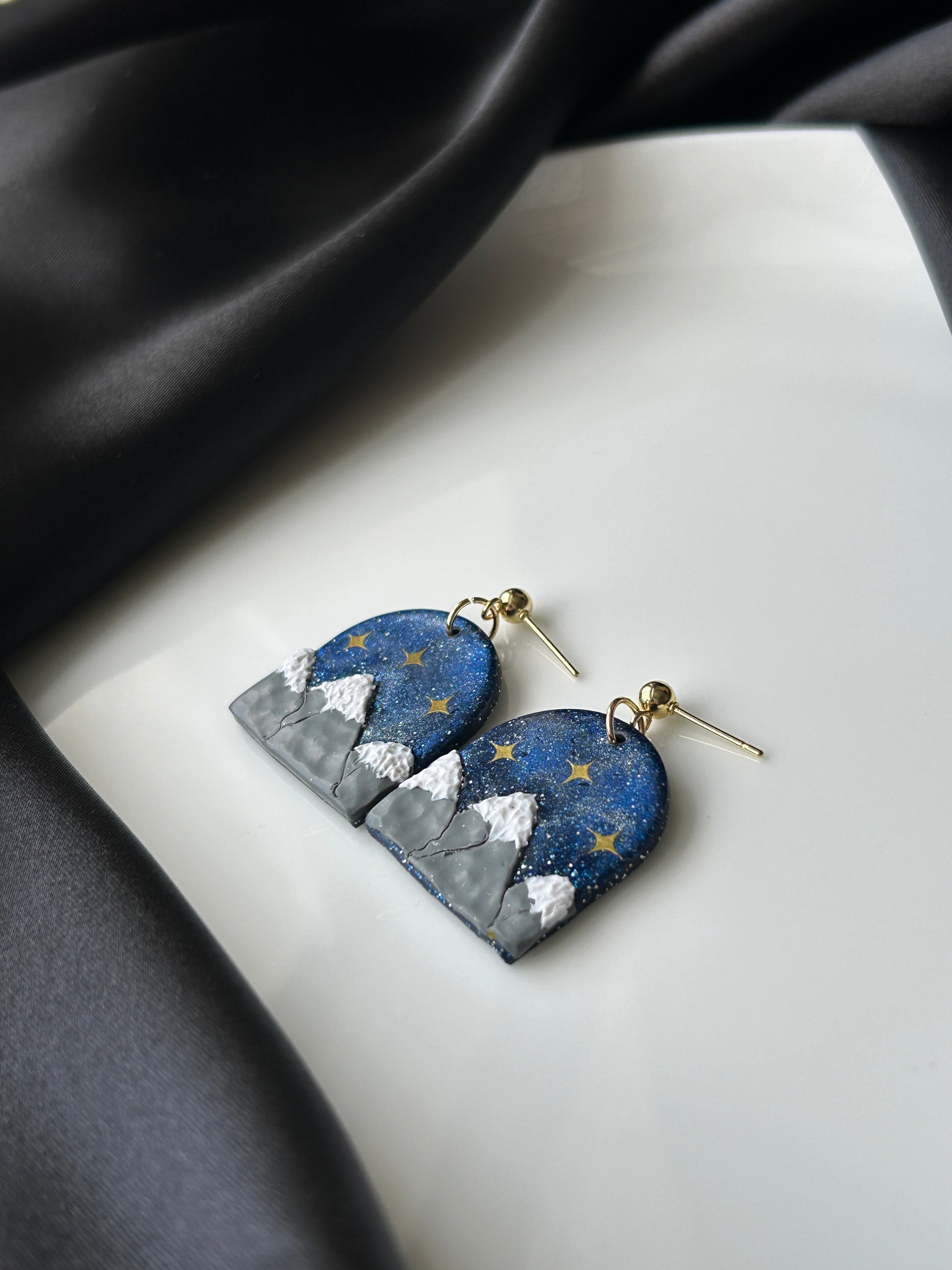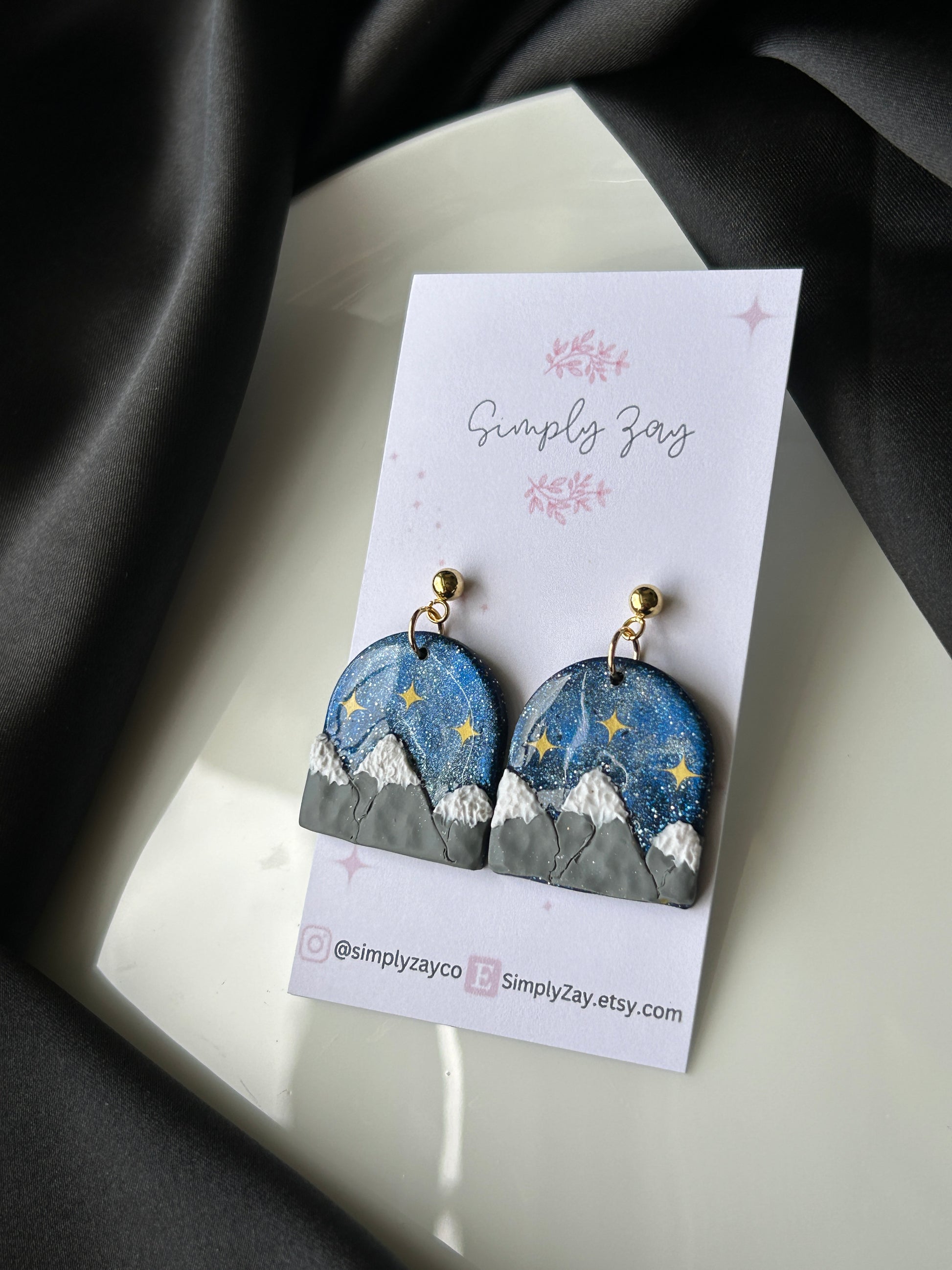 Each pair is crafted by hand using polymer clay, resin, and mica powder, finished with gold-plated hypoallergenic posts for sensitive ears. The textured mountain detail